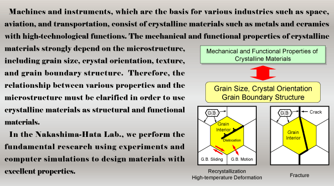 Properties of crystalline materials are strongly dependent on nanostructures such as crystallographic orientations, grain-boundary structures, dispersion of precipitates and dislocation arrangements. From this point of view, we investigate atomic-scale nanostructures by high-resolution electron microscopy and computer simulations such as molecular dynamics, and clarify relationships between the nanostructures and material properties and related phenomena such as plastic deformation and phase transformations. Recently, we intensively apply scanning transmission electron microscopy and three-dimensional electron tomography to analyses of crystalline defects in advanced materials such as dislocations, grain boundaries, precipitates, etc.